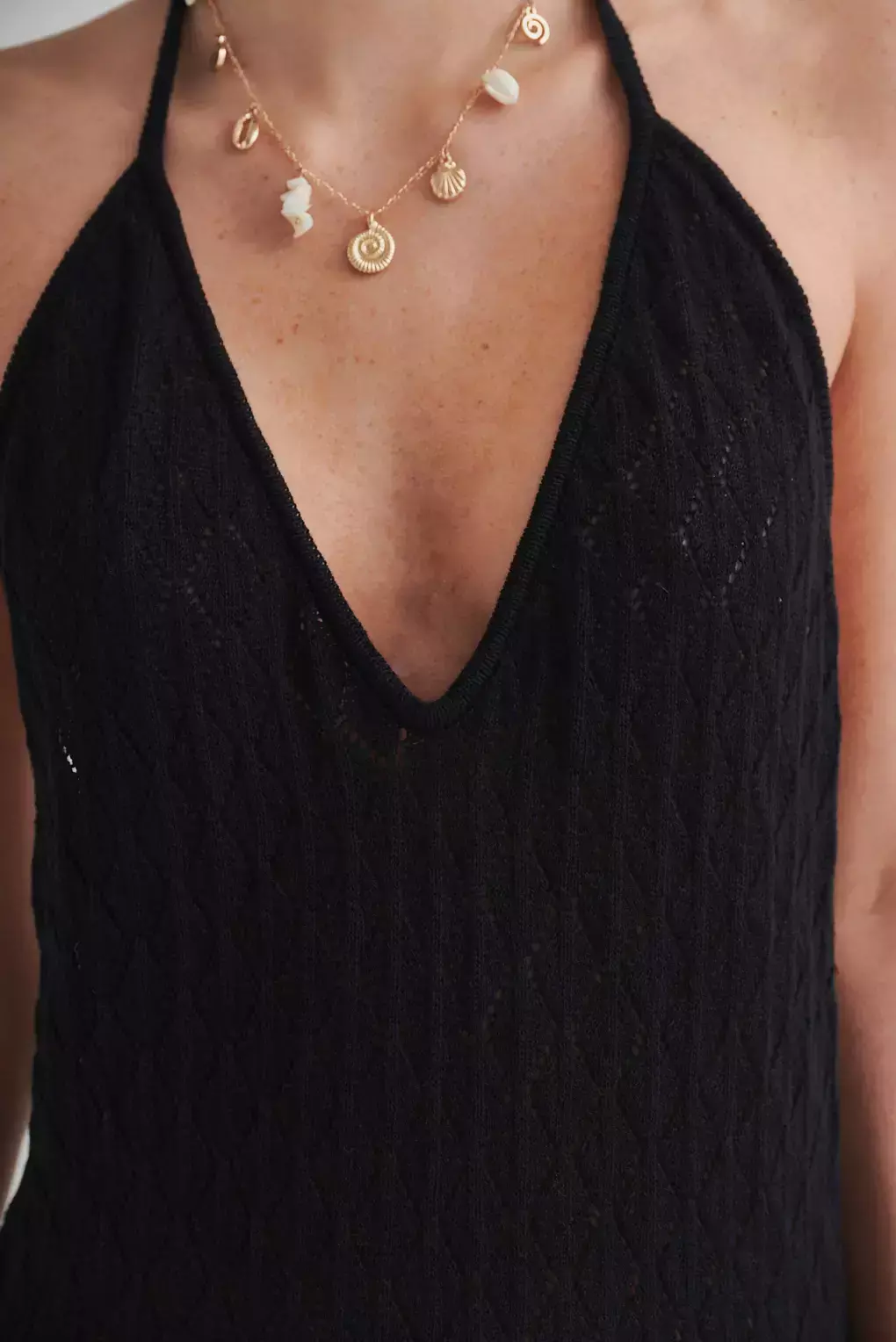 Con un profundo escote en V, esta prenda se adapta perfectamente para usar tanto de día como de noche. Su textura calada lo hace ideal para combinar con trajes de baño o con un top y short debajo, especialmente en climas cálidos.